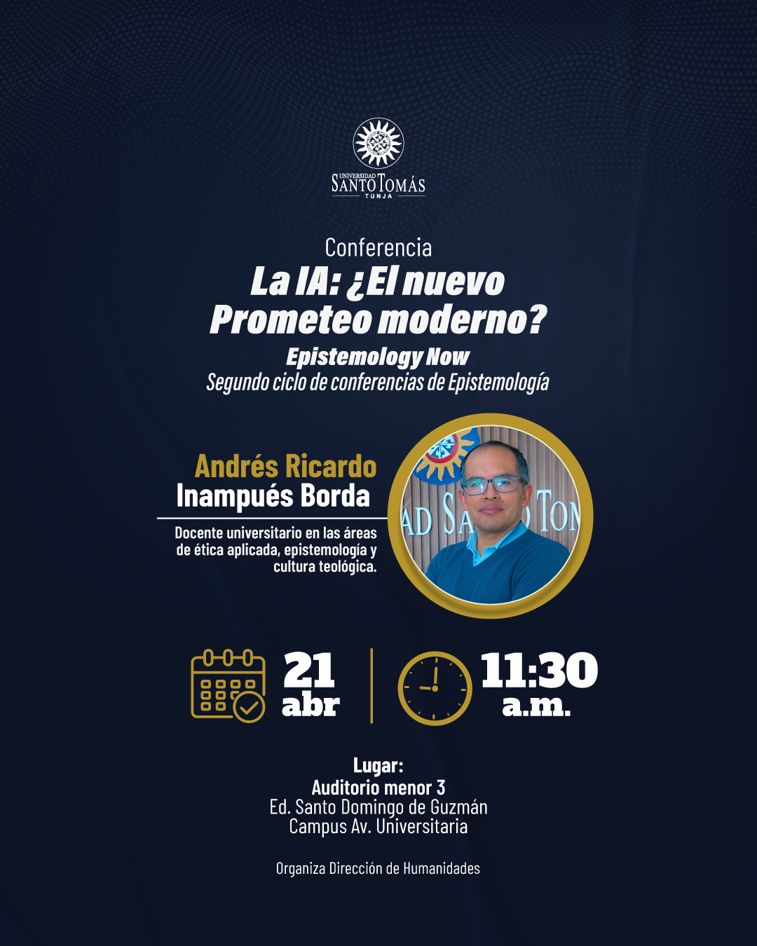 Ver Todos Los Eventos Conferencia La IA ¿El nuevo Prometeo Moderno? abril 21 @ 11:30 am - 1:00 pm Event Navigation « Capacitación productos apropiación social del conocimiento y divulgació pública de la Ciencia Conversatorio “seguimos caminando con la comunidad en el territorio” » Detalles Fecha: abril 21 Hora: 11:30 am - 1:00 pm Categoría del Evento: Dirección de Humanidades Organizador Dirección de Humanidades Lugar Auditorio Menor 3 Edificio Santo Domingo de Guzmán Campus Avenida Universitaria Tunja, Boyacá 150001 Colombia + Google Map + Google Calendar+ iCal Export Anterior Capacitación productos apropiación social del conocimiento y divulgació pública de la Ciencia Siguiente Conversatorio “seguimos caminando con la comunidad en el territorio”